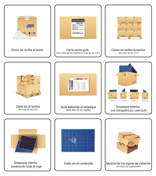 - Imágenes enfocando signos de violación o daño de la caja, paquete o tarima, de todos los ángulos posibles y sobre todo imágenes donde claramente aparezca el número de guía y datos de la compañía transportista.